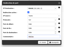 Se connecter sur l'interface d'administration de votre box - l'exemple ici est pour une Freebox -> Paramètres -> Gestion des Ports -> Ajouter une redirection (le +)