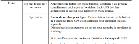 peut etre une nouvelle piste ... Cela serait cette perte de 10% qui ne plairait pas au NAS? Peut etre que pour compenser cette chute de tension, l'alimentation dont les condensateurs sont peut etre HS, tire plus d'intensité au moment d ela bascule sur batterie, puis l'onduleur passe donc en surcharge et tout s'éteint.