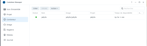 Une fois la récupération de l'image terminée, et lancement du conteneur ok, on retrouver notre conteneur "au vert" dans Container Manager" :
